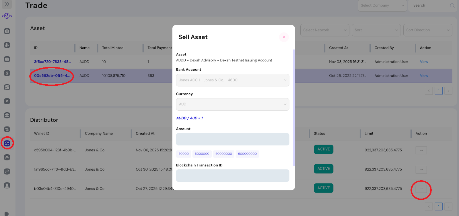 To select the chain you wish to Burn your AUDD from, click the Asset ID for your desired choice. The available wallet addresses should now appear in your Distributor list. Once you find the wallet you sent your AUDD from, click the menu button (denoted by 3 dots) in the Action column.