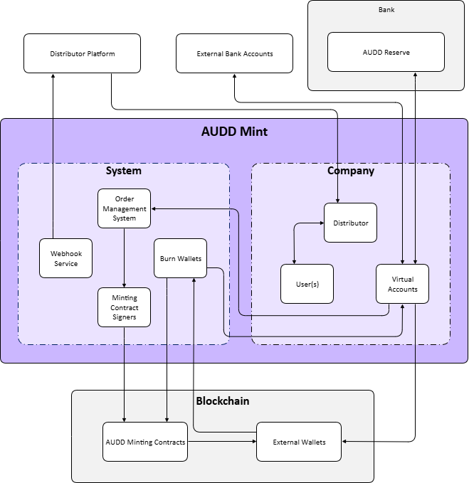 Below is a high-level view of the AUDD Mint architecture from the perspective of a Distributor integrating with the platform. It shows the major components, their relationships, and how value flows between them.